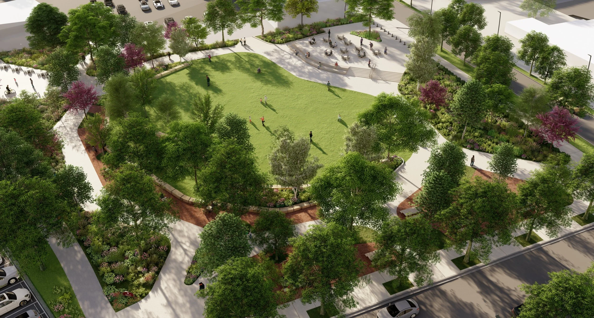 Located at 453 Forest Avenue, the first phase of park development includes demolition of the existing building and parking lot, creates new greenspace, open lawns, and winding paths that will connect our thriving community with a “front yard” for all and transform the area into an outdoor destination at an estimated cost of $5.6M. An area suitable for performances is incorporated into Phase 1 design.